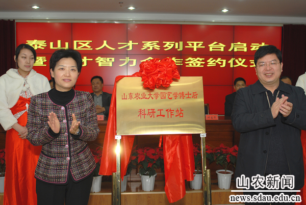 校党委书记邢善萍和泰安市委常委、组织部部长陈平为山东农大园艺学博士后科研工作站揭牌,副校长张宪省与泰山区区长赵斌签署人才智力合作协议。
