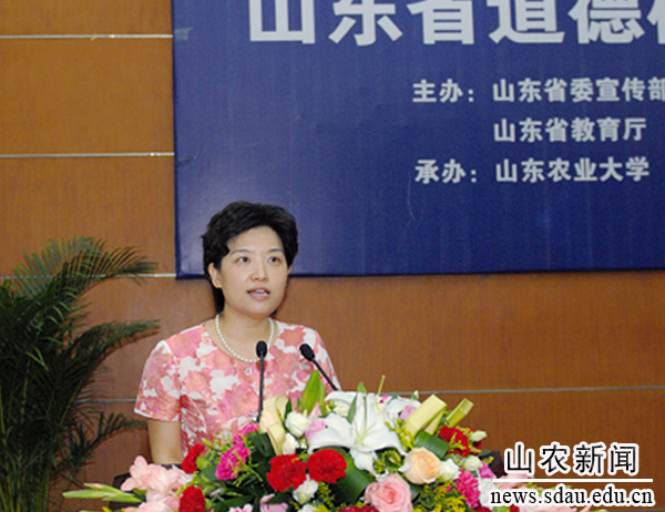 邢善萍在致辞中向道德模范孙莎莎、王钦峰致以崇高敬意,向出席活动的领导嘉宾表示诚挚欢迎。她介绍了学校长期以来坚持以理想信念教育为核心,以学生全面发展为目标,以道德模范为榜样,大力开展道德宣传教育,深入推进学雷锋活动,注重优良校风学风师风培养的情况。山东农业大学坚持“育人为本、德育为先”的理念,在人才培养、科技创新、服务社会和文化传承等各项工作中,始终贯穿了对道德准则与精神力量的崇尚和坚守,体现了广大师生对信念、勇气、善良、诚信和真爱的向往与追求,先后涌现出以全国师德先进个人、全国青年五四奖章获得者等为代表的一批先进教师模范和优秀学生典型,形成了知荣辱、讲道德、促和谐的校园文明新风尚。