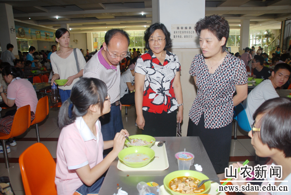 邢善萍等先后来到北校区的三个学生餐厅,查看餐厅饭菜质量、检查卫生状况,听取后勤处负责同志的汇报,向餐厅工作人员了解情况,并与就餐学生亲切交谈。