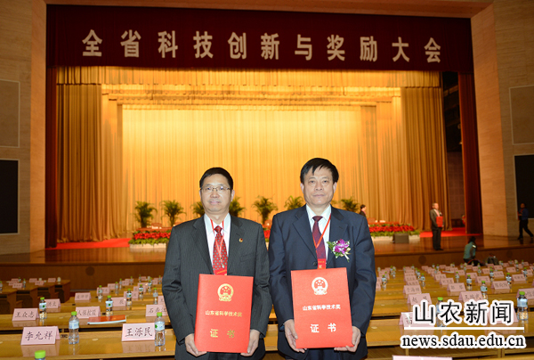 11月23日,全省科技创新与奖励大会在济南隆重举行,姜异康、姜大明等省领导为获得2012年度山东省科技奖的获奖者代表颁奖。由我校张宪省教授等完成的“植物生殖器官的发育与激素调节”获得今年唯一的山东省自然科学一等奖,这也是我校首次获得山东省自然科学一等奖。由陈学森教授等完成的“杏和李等核果类果树种质资源挖掘、创制与利用”获得山东省科技进步一等奖。