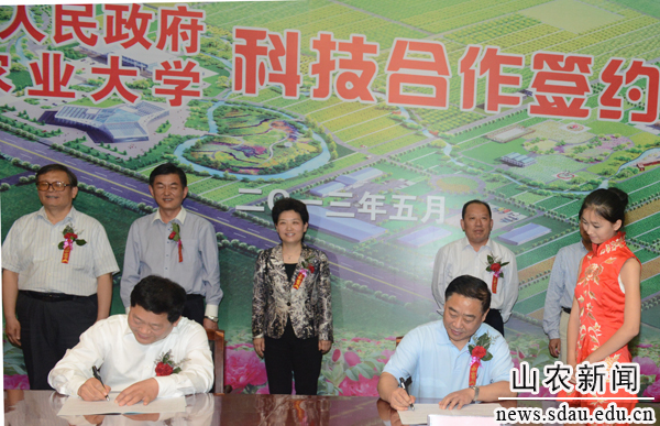 温孚江与朱云生代表山东农业大学和平阴县政府签署科技合作框架协议。主要合作形式有科技项目合作、人才智力合作、技术指导和培训、机构设施联建,重点合作领域在农业新品种选育及其配套技术研究、畜禽良种选育及健康养殖与疫病防控、农林畜产品精深加工、农林生物质及畜禽粪便综合开发利用、生物资源保护与农林生态安全、农业资源高效利用与节水农业、现代农业装备技术。