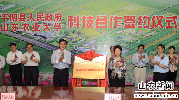 5月18日,山东农业大学与平阴县科技合作协议在平阴县签订,平阴玫瑰、食用菌、山地绵羊、无核葡萄、小麦、生态治理和规划等多个合作意向协议签署。同时,“山东农业大学新农村发展研究院玫瑰产业技术示范基地”揭牌。我校党委书记邢善萍、校长温孚江,平阴县县委书记朱红方、县长朱云生,我校相关学院、部门人员,平阴县有关单位成员共同参加协议签字仪式。