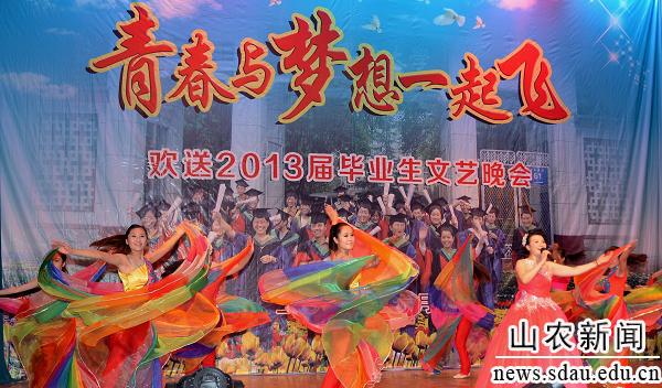 6月20日,由校团委、学工处主办的“青春与梦想一起飞”山东农业大学欢送2013届毕业生文艺晚会在校本部西礼堂激情上演。学校领导邢善萍、温孚江、孙永华、董新胜、车先礼、朱莉、嵇景涛,以及各部门、各学院负责同志与2000多名师生共同观看了晚会。