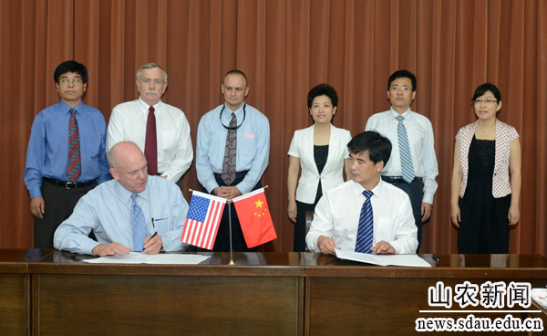 6月27日,山东农业大学与密西西比州立大学合作协议签字仪式及座谈会在文理大楼举行,党委书记邢善萍出席并介绍学校情况,党委常委、副校长高东升与密西西比州立大学森林资源学院、农学院院长Hopper教授代表双方签署合作协议。