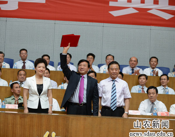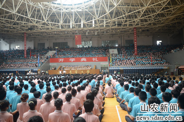 9月13日,南校区体育馆里彩旗飘舞,歌声飞扬,洋溢着热烈欢快的气氛,山东农业大学2013级新生开学典礼在这里隆重举行。