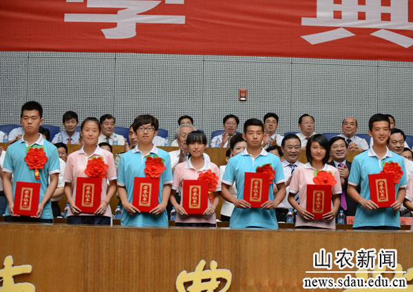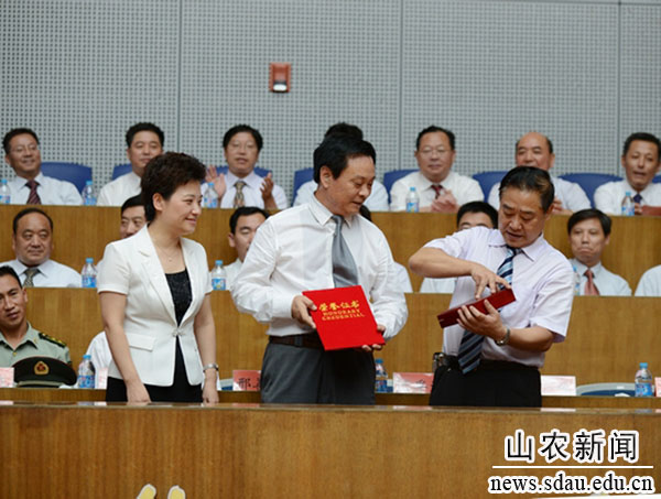 开学典礼上为我校第二届杰出校友奖获得者国务院发展研究中心副主任韩俊、山东绿霸化工有限公司董事长赵焱、莱芜职业技术学院党委书记师承瑞颁了奖。韩俊代表第二届杰出校友在致辞中感谢母校的培养和褒奖,衷心祝愿母校繁荣昌盛,明天更美好!