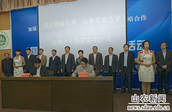10月15日上午,国家质检总局与山东农业大学加强进出境动植物及其产品检验检疫领域战略合作协议签字仪式在南校区举行。2013年山东检验检疫局“国门生物安全进校园”活动同时启动。国家质检总局副局长、党组成员魏传忠与有关司局长,山东检验检疫局、质量技术监督局负责人,泰安市政府,深圳检验检疫局、泰安检验检疫局、泰安市质量技术监督局负责人,山东农业大学邢善萍、张宪省、嵇景涛等领导及有关部门和学院负责人出席活动。