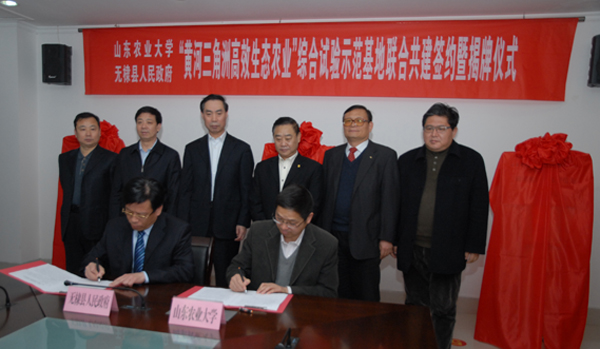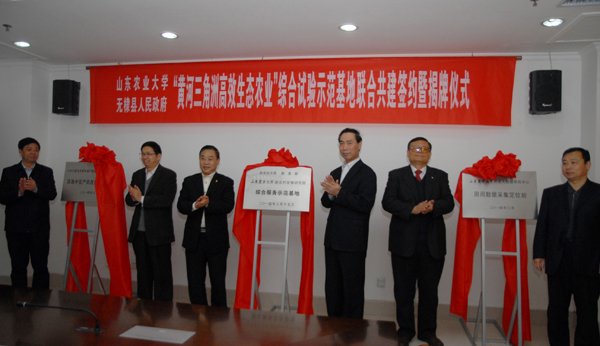 3月15日,山东农业大学与无棣县人民政府联合共建“黄河三角洲高效生态农业”综合试验示范基地签约暨揭牌仪式在无棣县举行。山东农大校长温孚江、副校长张宪省,学校科技处处长米庆华,滨州市人大常委会常务副主任曹兴宽、副市长李维东,无棣县县委书记李恩波共同为基地揭牌。张宪省与无棣县县长丁海堂签署合作协议。