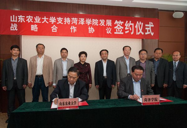 4月15日,山东农业大学支持菏泽学院发展战略合作协议在菏泽市签订,双方将在人才培养、学科发展、队伍建设和科学研究等方面开展多方位合作。我校领导邢善萍、温孚江、张宪省、董新胜、高东升、刘兴坦,菏泽学院领导张存金、王焕良、赵普、孟令美、黄济民,我校有关部门、学院负责人及部分专家教授,菏泽学院有关部门、学院负责人共同参加协议签订仪式。山东农大校长温孚江与菏泽学院院长王焕良签署合作协议。