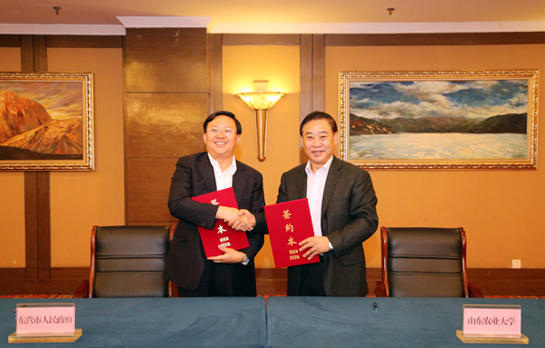 根据协议,山东农大将与东营市联合共建山东农业大学“黄河三角洲现代农业试验示范基地”,围绕黄河三角洲地区现代农业发展的需要,政产学研用和农科教紧密结合,积极推进现代农业技术协同创新、盐碱地长期定位研究、农业大数据研究、人才培养、技术服务和科技成果转化推广工作,推动黄河三角洲高效生态经济区现代农业向绿色、生态及可持续方向发展。