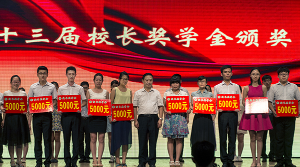 6月16日晚,学校在北校区西礼堂举行欢送2015届毕业生文艺晚会。学校领导徐剑波、温孚江、董新胜、车先礼、孙永华、张宪省、朱莉、嵇景涛、吴衍涛出席晚会,各单位各部门主要负责人,各学院分管学生工作的党委副书记、团委书记与毕业生代表一同观看晚会。晚会现场,校长温孚江为毕业生颁发了第十三届校长奖学金。