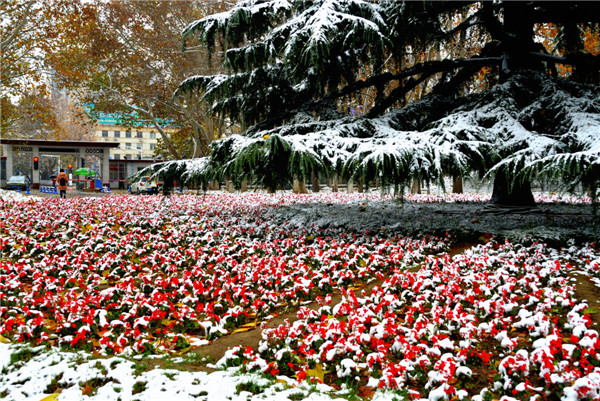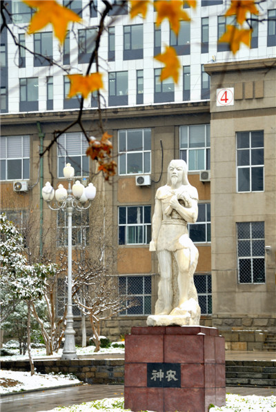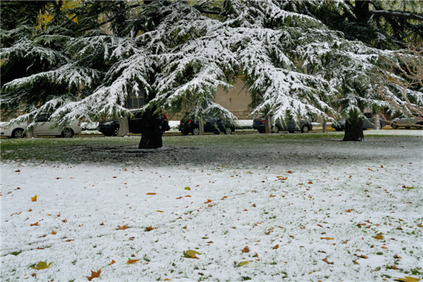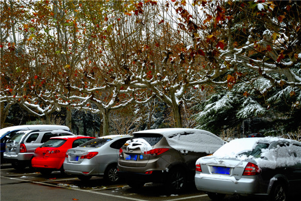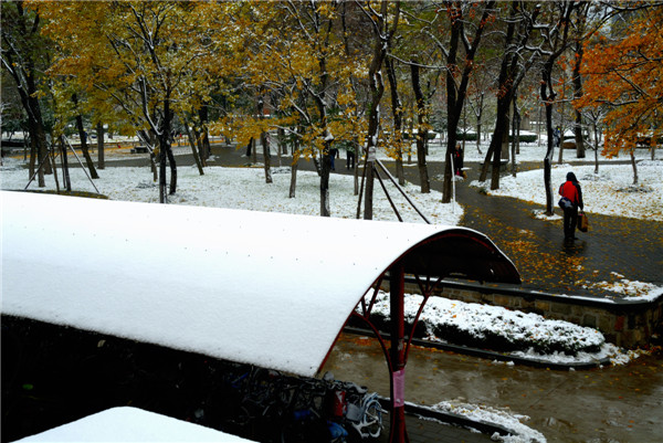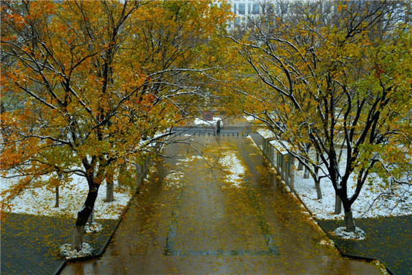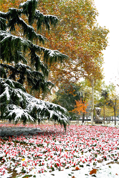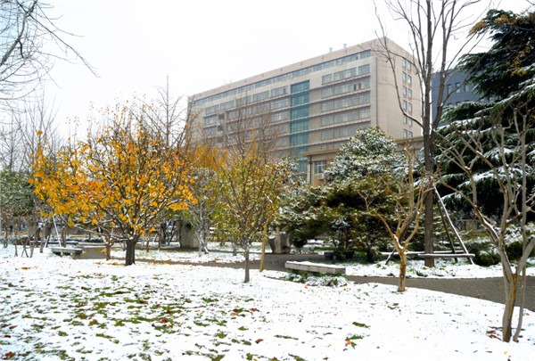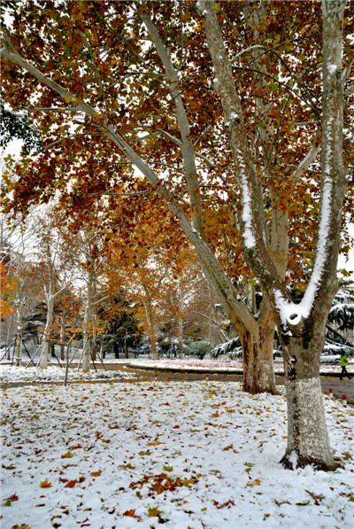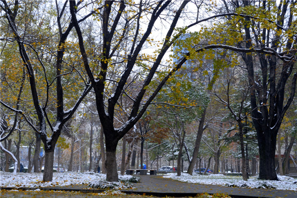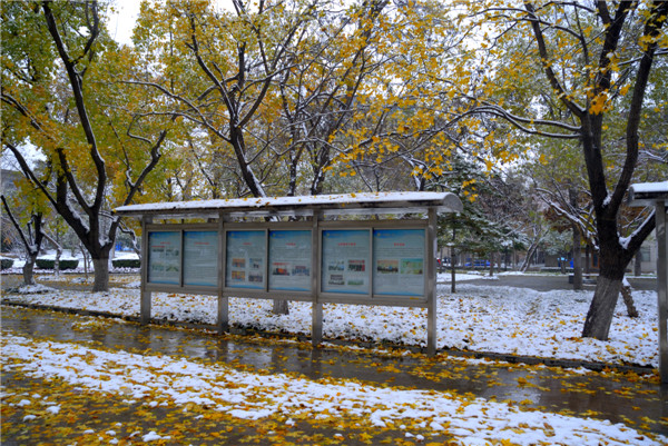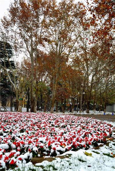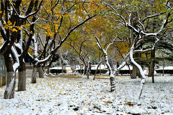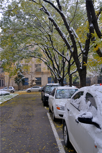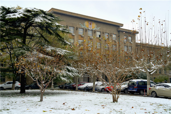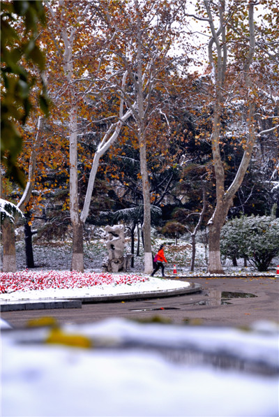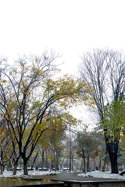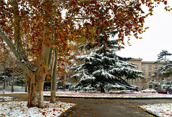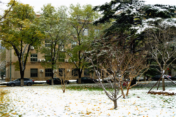 寒气袭人,初雪不期而至,银装素裹,景致纯净素雅。昨日校园秋韵,今朝雪花飘飘,两番天地,别样神韵,最爱山东农业大学。
