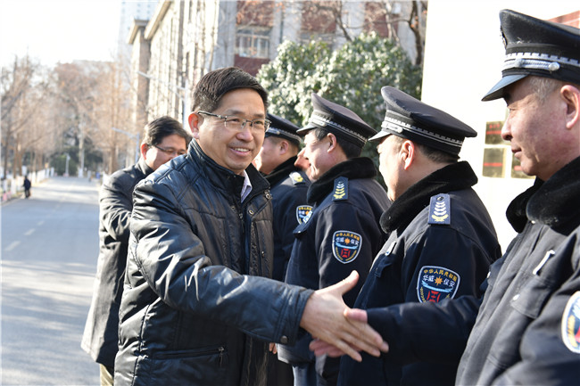 张宪省一行来到北校区、东校区和南校区三个校区的门卫、110值班室、国重楼、配电室、校医院、家属院物业、加热换气站、安保监控室、青蓝公寓、水电中心等值班点,向坚守工作岗位的值班人员表示亲切问候。他说:“大家平时在工作岗位上兢兢业业,春节期间还要坚守岗位,非常辛苦,我代表全校教职工向你们表示衷心感谢,祝大家新春快乐,阖家幸福。”