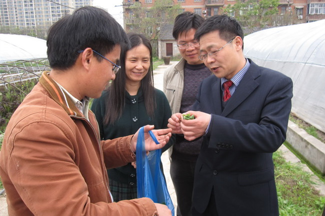 图为张修国教授(右一)实地指导蔬菜病虫害防治