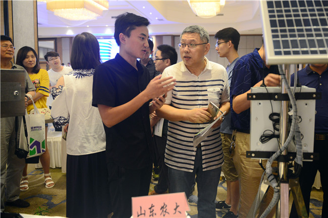 工作人员向与会专家介绍由山东农业大学研发的物联网设备