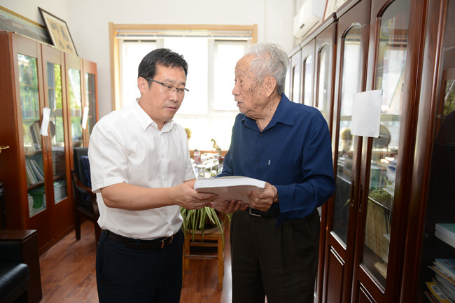 党委副书记朱莉走访了中国工程院院士于振文,感谢他在教书育人岗位上辛勤耕耘、默默奉献,与他促膝相谈,话家常、问健康,嘱咐他保重身体,愉快生活。