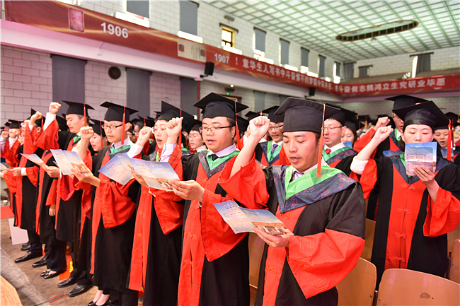 在典礼上,生科学院王勇教授作为导师代表发言,勉励研究生毕业生要传承农大人厚德载物、奋发有为、求真创新、实干奋进的精神,积极发扬泰山“挑山工精神”,不折不挠,砥砺前行,为国家的繁荣富强建功立业。农学院博士研究生王维在发言中代表全体毕业生对母校致以崇高的敬意,表达了对母校的感恩和眷恋之情,并带领大家宣誓。