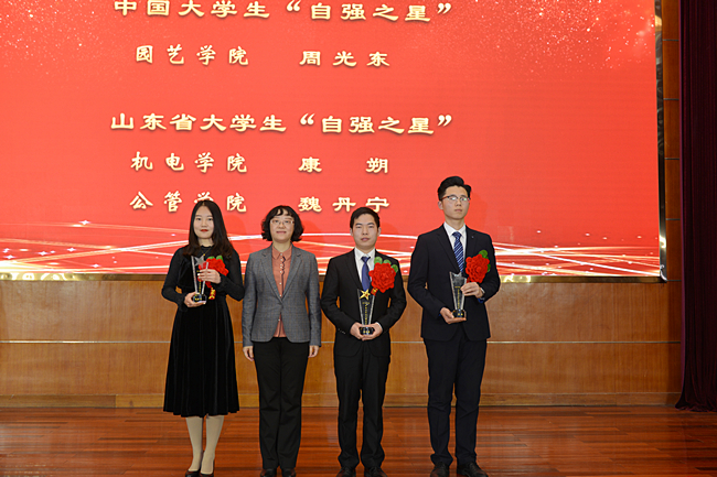 “自强之星”是可亲、可敬、可信、可学的青年榜样先锋。2019年,周光东、徐达、赵弘扬获得“中国大学生自强之星”荣誉称号,康朔、魏丹宁获“山东省大学生自强之星”荣誉称号。副校长张然为获奖代表颁奖。