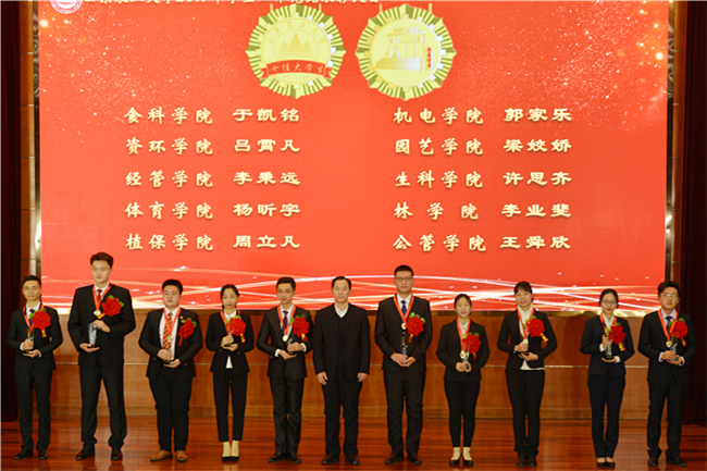 颁奖典礼前,十佳大学生代表、食科学院于凯铭,十佳班主任代表、机电学院教师张军,创新创业工作先进单位代表、植保学院党委书记刘孟臣先后作工作汇报。