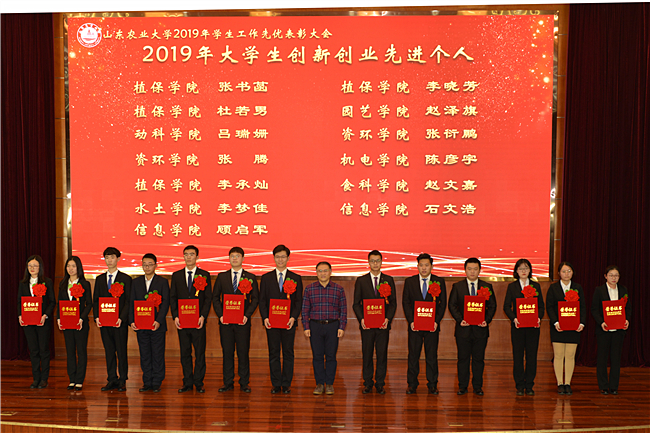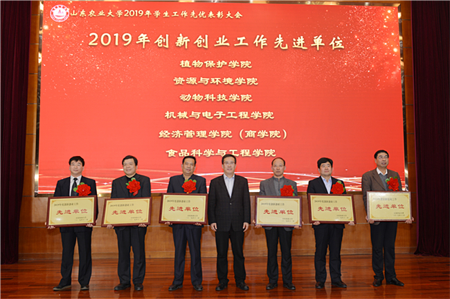 2019年,全校师生齐心协力托起山农学子的双创梦想。植保学院、资环学院、动科学院、机电学院、经管学院、食科学院荣获“创新创业工作先进单位”,37名学生获评“创新创业之星”,37名教师获评“优秀指导教师”。党委书记徐剑波为获奖单位颁奖。