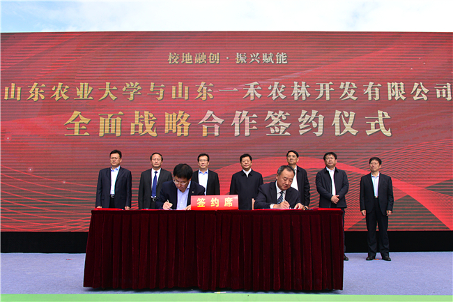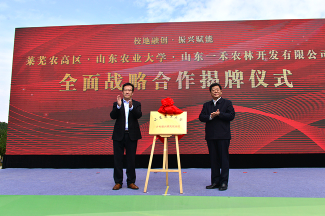 10月14日,山东农业大学与济南市莱芜农高区、山东一禾农林开发有限公司签署全面战略合作协议,深入推进校地校企合作。党委书记徐剑波、济南市莱芜区委书记朱云生出席签约仪式,共同为“山东农业大学乡村振兴研究院分院”揭牌。副校长李向东、莱芜区委副书记吕宝泉分别致辞。