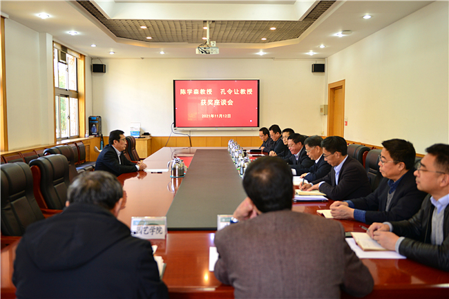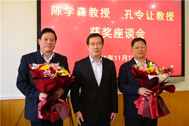 11月12日,学校召开陈学森教授、孔令让教授获奖座谈会。党委书记徐剑波为两位专家送上鲜花,祝贺他们取得优异成绩,号召全校师生深入学习贯彻党的十九届六中全会精神,以陈学森教授、孔令让教授为榜样,坚定爱党爱国信念,不忘立德树人初心,践行强农兴农使命,弘扬扎实苦干的优良作风,在学校高水平大学建设进程中作出新成绩,为实现第二个百年奋斗目标、实现中华民族伟大复兴的中国梦贡献更大力量。