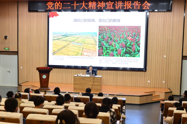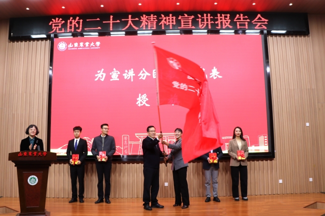 11月16日上午,学校举办党的二十大精神宣讲报告会暨宣讲启动仪式。山东农业大学党的二十大精神宣讲团团长、党委书记徐剑波以“学习宣传贯彻党的二十大精神 争做知农爱农强农兴农时代新人”为题,为学校师生代表作宣讲报告。党委副书记张然主持报告会。