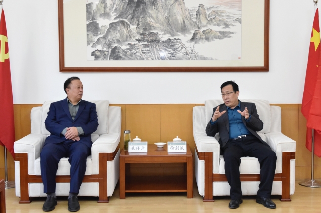 近日,鲁粮集团党委书记、董事长孔祥云一行来校考察对接工作。党委书记徐剑波会见客人,围绕拓展校企合作,共同为维护国家粮食安全贡献力量进行深入交流。党委副书记、校长冷畅俭与客人座谈。