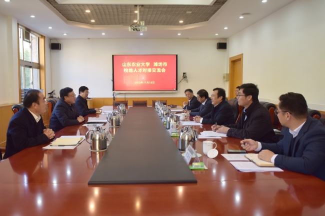 徐剑波向刘运一行表示热烈欢迎,向潍坊市委、市政府长期以来对山东农业大学给予的大力支持表示感谢,并介绍了学校办学基本情况和近年来在人才培养、科技创新、学科建设、社会服务等方面的成效。他说,2023年以来,学校精准对接产业需求,紧扣产业链人才需求,协同国内外优势科研力量,校地企深入合作,先后成立德州(齐河)小麦产业研究院、聊城茌平现代设施农业产业研究院、泰安肥城泰山番茄创新研究院和淄博国家苹果工程技术研究中心沂源实验室,打造全国种质资源创新高地,推动资源优势转化为产业优势。徐剑波表示,服务现代农业产业化发展,打造乡村振兴齐鲁样板,推动区域经济社会发展,是农业大学和农业大市共同的责任,今后农大将更加积极主动融入潍坊建设发展,精准对接地方产业需求,加快科教产融合发展,为推动校地双方高质量发展注入强劲动力,为农业强省建设提供强有力的支撑。