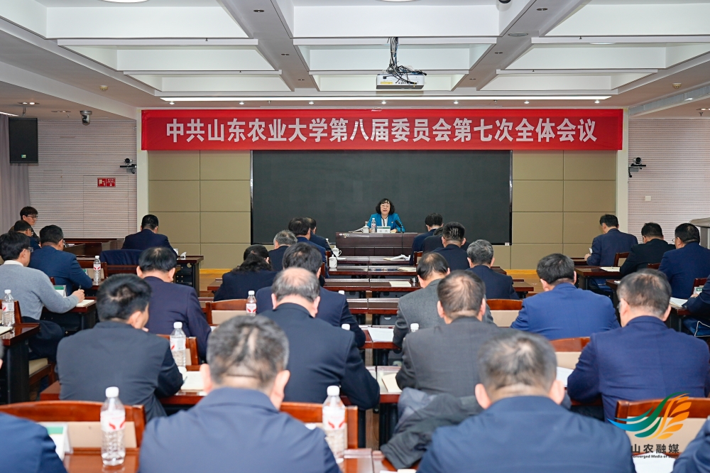 山农融媒2月27日讯 中共山东农业大学第八届委员会于2026年2月27日召开第七次全体会议,全会坚持以习近平新时代中国特色社会主义思想为指导,全面贯彻落实党的二十大和二十届历次全会精神,深入贯彻习近平总书记关于党的建设的重要思想、关于树立和践行正确政绩观的重要论述和视察山东重要讲话重要指示精神,认真落实省委、省政府工作部署,审议《中国共产党山东农业大学第八届委员会常务委员会2025年度工作报告》《中共山东农业大学委员会关于深入贯彻党的二十届四中全会精神凝心聚力、加压奋进,坚决打赢“双一流”突破攻坚战的决议》,党委书记张然在会上作了讲话。